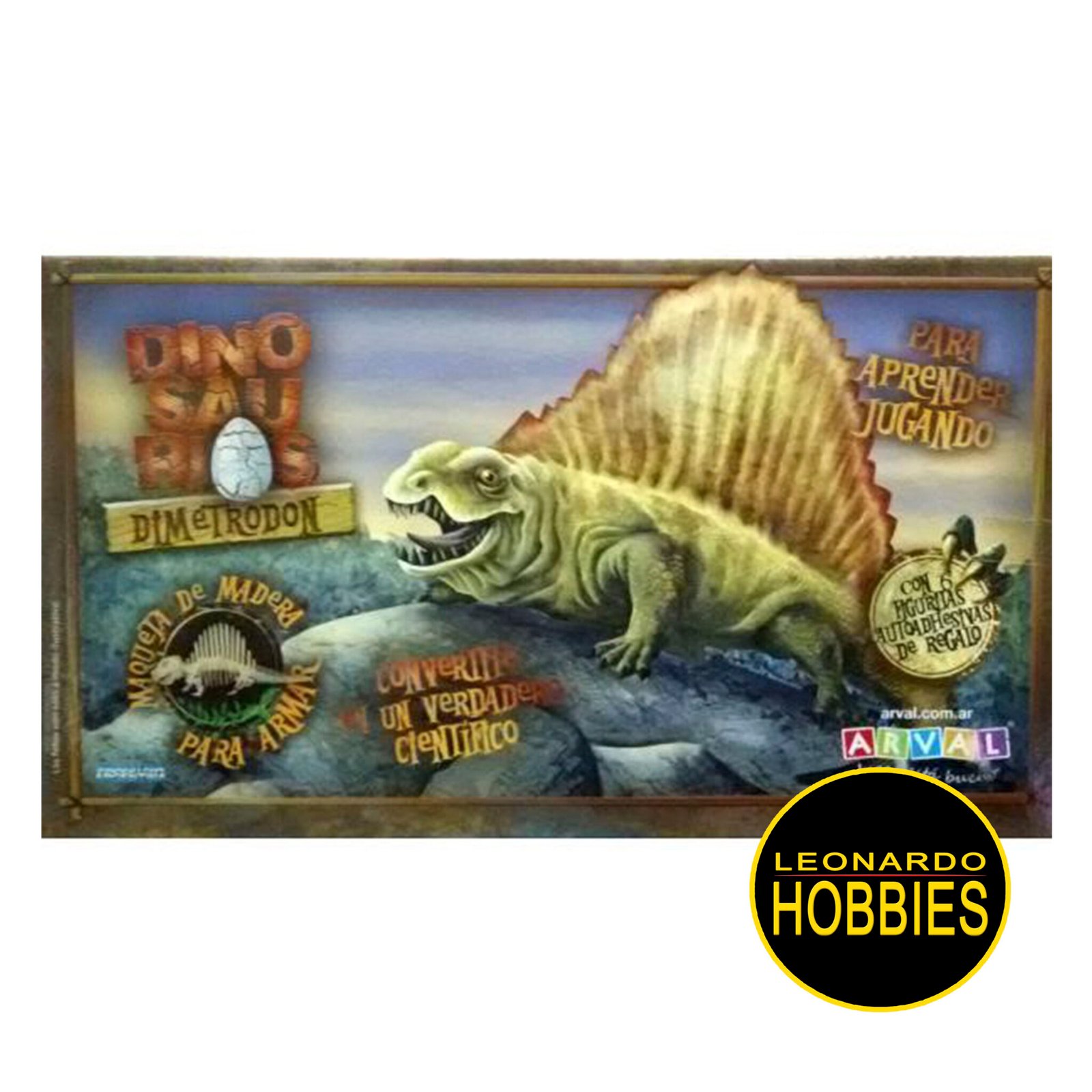 Contenido: 1 maqueta de MDF para armar, 6 figuritas autoadhesivas de dinosaurios e instrucciones de armado.