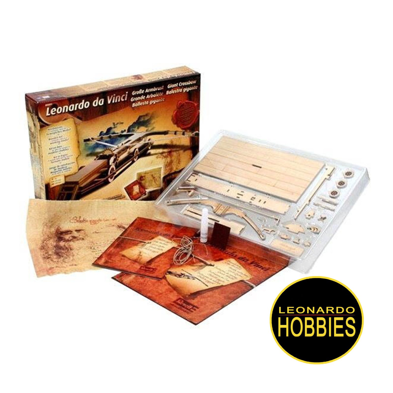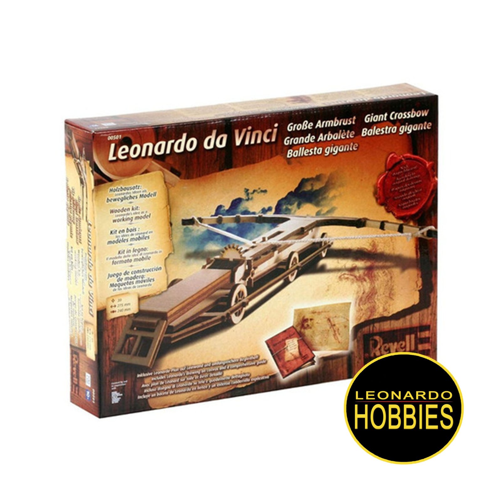 El 2 de mayo de 1519 murió probablemente el mayor genio universal de todos los tiempos Leonardo da Vinci. Revell honra al artista, anatomista e ingeniero con una selección de kits de sus mejores inventos. Los elaborados modelos hechos de madera auténtica son a veces móviles y permiten acercarse mucho a las innovadoras ideas de Leonardo. Esta ballesta, un verdadero «sueño tecnológico», iba a ser utilizada, en las intenciones de Leonardo, para lanzar grandes bolas de piedra, creando pánico y espanto entre el enemigo. El dibujo de esta máquina, tan grandioso como irrealizable, se caracteriza por un refinamiento particular. Las proporciones eran colosales y Leonardo representó su impacto dibujando un soldado que manejaba el arma, con la intención de utilizar el sistema de gatillo: los brazos tenían una envergadura total abierta de 42 braccia, unos 24 m, montados sobre una culata de 23 m de largo y 1,2 m de espesor. . La máquina se movía sobre seis ruedas. Las ballestas todavía estaban en uso durante la época de Leonardo, y podían disparar flechas con mayor precisión que las primeras armas de fuego, además de tener una elevada capacidad de penetración.